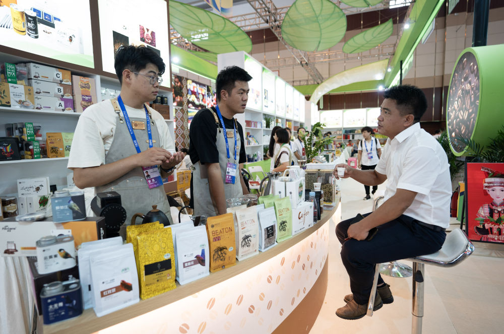 ??來自云南保山的參展商在第七屆中國—南亞博覽會上向參觀者介紹咖啡產(chǎn)品(2023年8月16日攝)。新華社記者 陳欣波 攝
