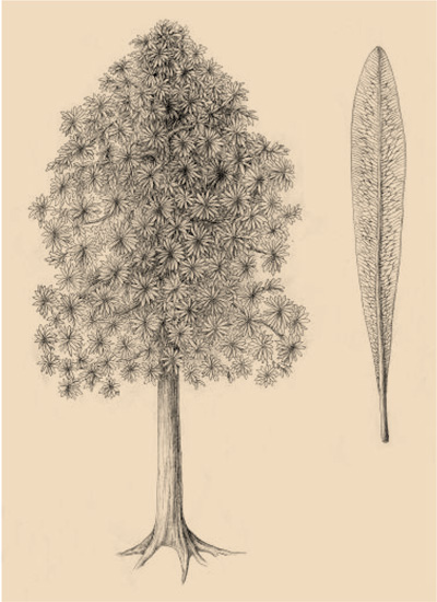 珠穆朗瑪峰北側(cè)的二疊紀(jì)舌羊齒及其葉片復(fù)原,距今約2.6億年,是典型的南方岡瓦納大陸植物,其植株可達(dá)6米高。吳飛翔繪,選自《山海折疊:青藏高原的生命史詩(shī)》。