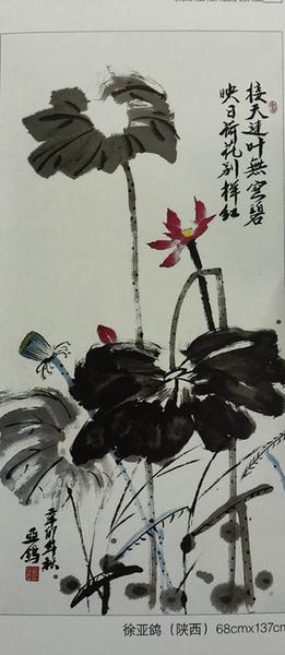 2013年12月,在西安舉行的全國紀(jì)念劉志丹誕辰110周年活動中,全國各地名家送來不少書法繪畫作品,有劉志丹肖像素描,有劉志丹與領(lǐng)袖人物的工作生活圖,有作者自吟詩詞的書法,皆堪稱佳作。當(dāng)徐亞鴿女士的荷花《高潔圖》展現(xiàn)時,不禁使大家眼前一亮,給人一種無形的沖擊力。荷花不艷不淡,不多不少,不大不小,有開有苞,綠色的荷葉陪襯期間,枝干端直挺拔,魚兒在其間戲水,偶有幾只蜻蜓在空中點水嬉鬧,仿佛還能聽到蜻蜓嗞嗞的飛聲……雖然時至寒冬,卻霧霾全無,滿目的荷花美景,滿目的碧水藍(lán)天!