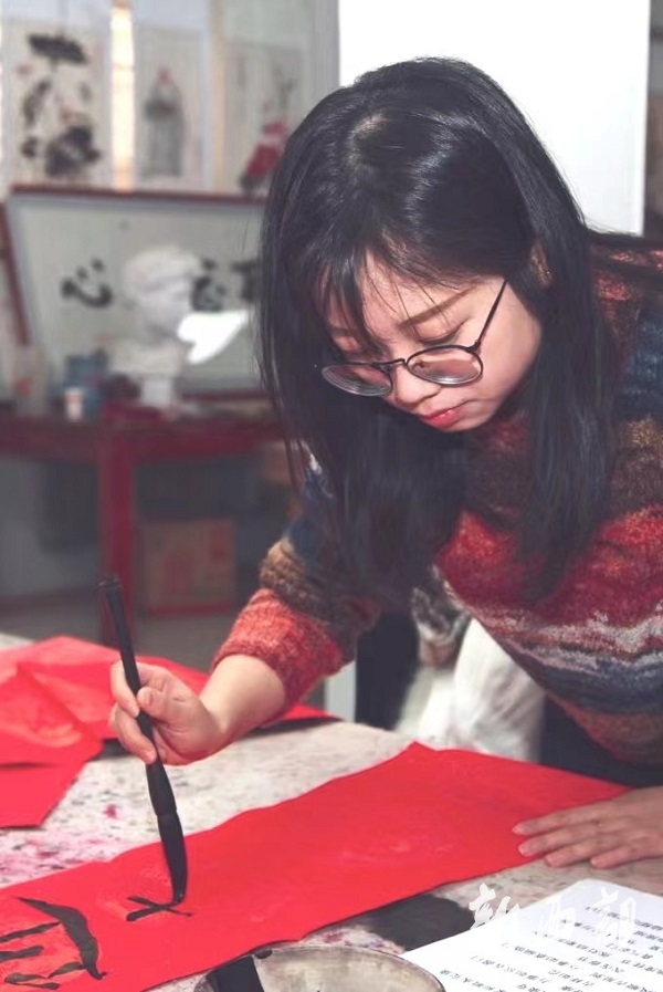 魏雯副研究員在書寫春聯(lián)
