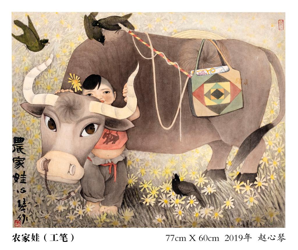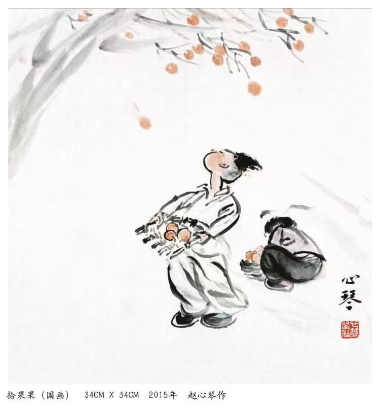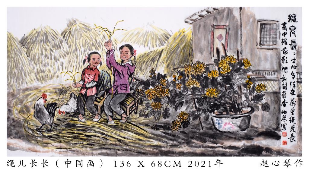 “且將煩惱拋春水,未泯童心放紙鳶”,在文人墨士的心目中,童心是很向往的一種心態(tài),就連婦孺皆知的齊白石大師,晚年畫作中都無處不透露著童趣,對自己童年時光的緬懷。我們再看趙心琴的書畫作品,她對童心的追求、描繪和書寫,正是她書畫藝術(shù)創(chuàng)作、審美觀念成熟和發(fā)展的結(jié)果。她的作品如果用四個字形容的話,便是很接地氣,她作品的靈感來源于她對生活的熱愛,對現(xiàn)實的感悟,對萬物的觀察體味,以及根植于她內(nèi)心深處的童趣未泯、素雅淳厚、天人合一的質(zhì)樸情懷。
