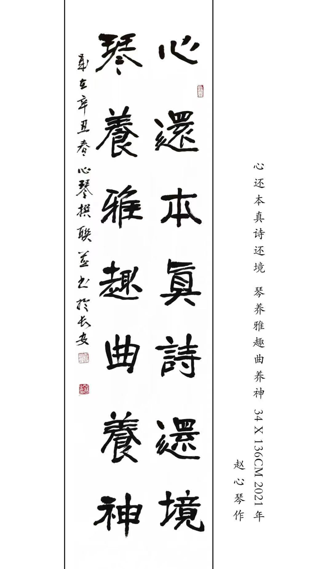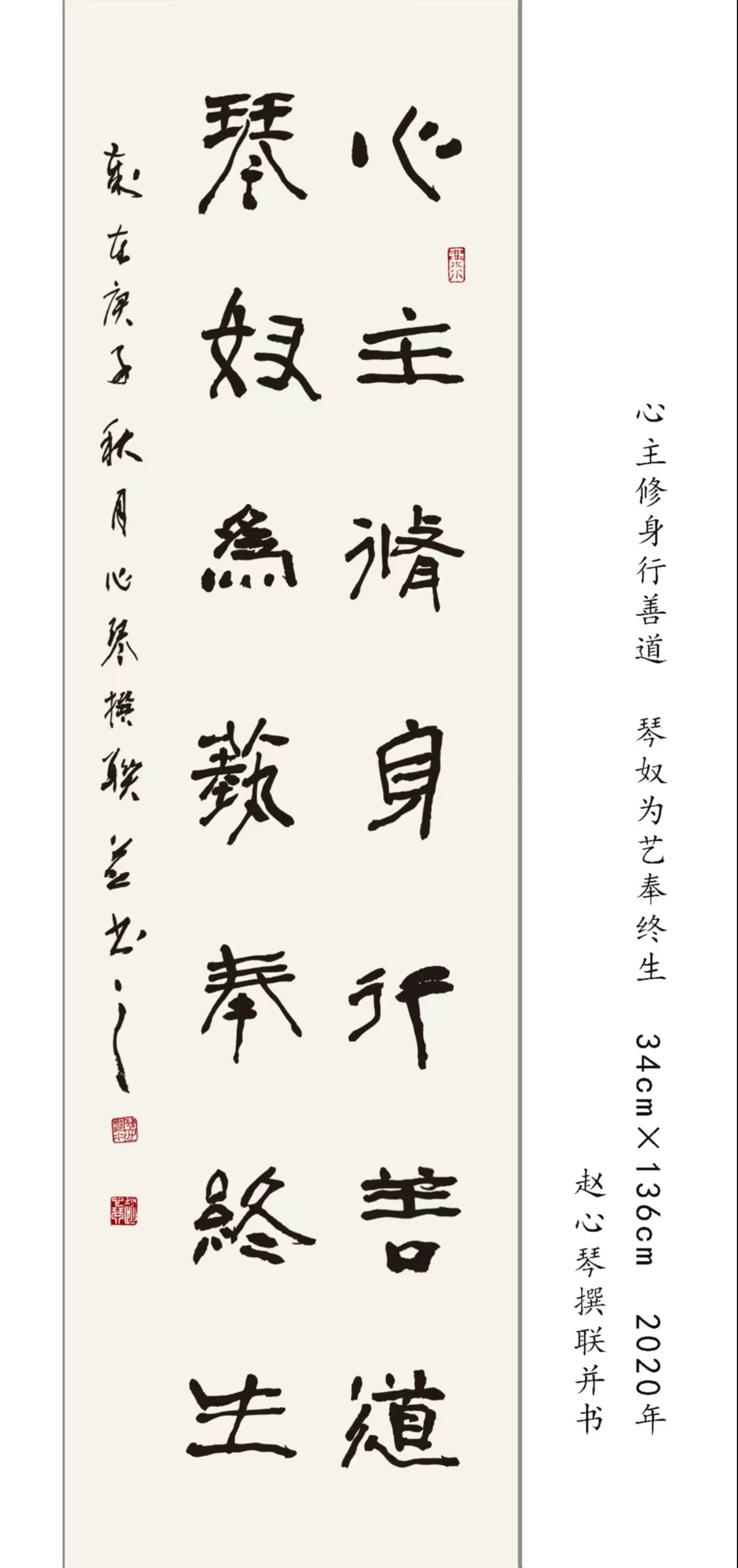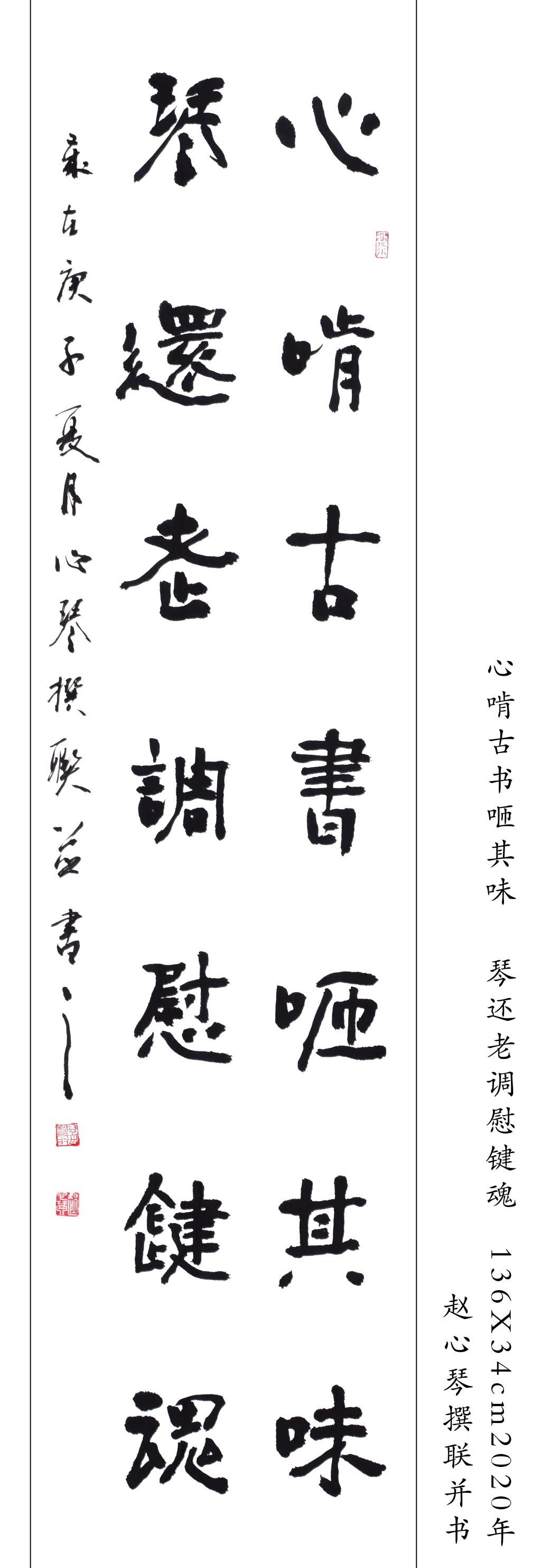 趙心琴是一個近乎“完美”的綜合性書畫藝術(shù)家,她不但作文、跳舞獲過獎,在中國畫創(chuàng)作上有自己的意象圖騰和想法,而且在書法、工筆畫和版畫創(chuàng)作上,也有自己的建樹,特別是在書法創(chuàng)作上,她用自己名字中的“心琴”二字撰寫并書法的近千幅嵌名藏頭對聯(lián),真讓人拍手叫絕。當(dāng)然,作文的難度很大,沒有一定的文化積累和綜合素養(yǎng),這個是寫不出來的。至于趙心琴其它藝術(shù)方面的成就,在這里就不一一贅述了。