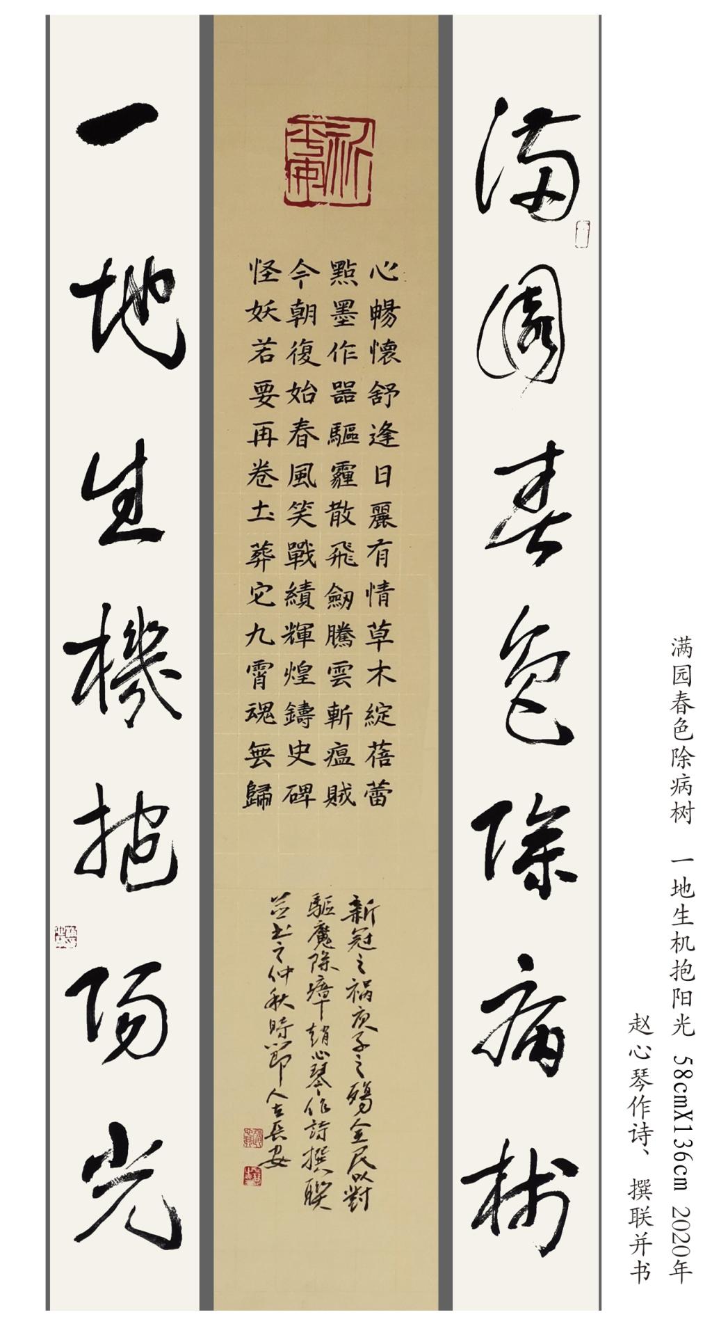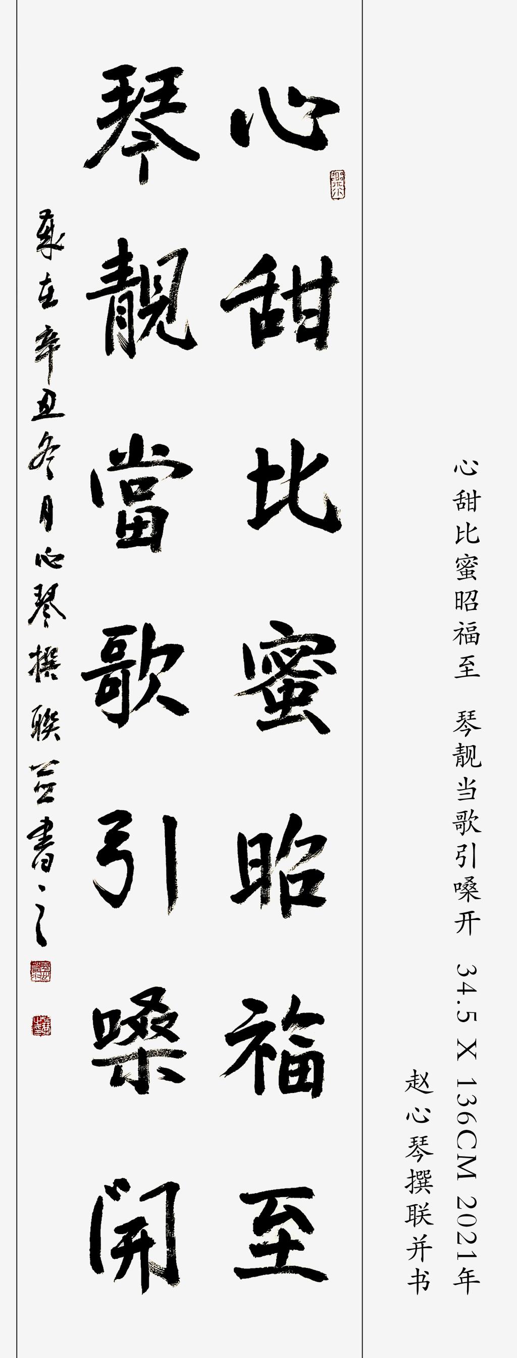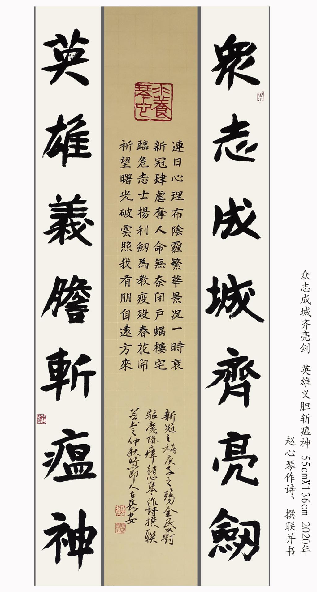 趙心琴是一個近乎“完美”的綜合性書畫藝術(shù)家,她不但作文、跳舞獲過獎,在中國畫創(chuàng)作上有自己的意象圖騰和想法,而且在書法、工筆畫和版畫創(chuàng)作上,也有自己的建樹,特別是在書法創(chuàng)作上,她用自己名字中的“心琴”二字撰寫并書法的近千幅嵌名藏頭對聯(lián),真讓人拍手叫絕。當(dāng)然,作文的難度很大,沒有一定的文化積累和綜合素養(yǎng),這個是寫不出來的。至于趙心琴其它藝術(shù)方面的成就,在這里就不一一贅述了。