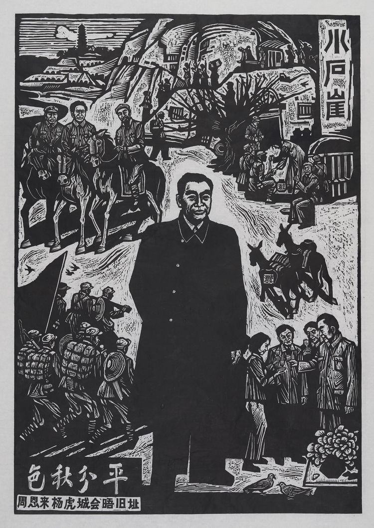 創(chuàng)作《周恩來總理》木刻,對自己是一次心靈洗禮,從最初的歷史零散片斷和有限資料中,反復(fù)畫小構(gòu)圖、變體畫。模糊的人物,混沌的場景,遠(yuǎn)去的歲月,還原這一段歷史瞬間,讓周總理的形象從歷史云煙中顯現(xiàn)。構(gòu)思草圖階段,焦慮的情緒;恍惚的感覺;流動的印記;夢中的回味。激動過,興奮過,徘徊過,痛苦過,疑惑過。有時又冷卻,去山里尋趣,用水墨與山水交流。換一種思維,多一樣視角?;氐疆嬍?,腦中閃動歷史風(fēng)煙,周恩來和毛澤東、朱德騎馬行進(jìn)在長征途中,延水岸邊。曙光從延安寶塔山升起,延河水從高原奔流而來,滾滾奔騰入黃河。你聽!黃河在怒吼,那是民族的吶喊,團(tuán)結(jié)奮進(jìn)。東渡的紅旗已展開,浪花激揚(yáng),號子聲聲……偉人的胸懷是博大的,一生是厚重的。細(xì)節(jié)見精神,將詩性語言融入木刻中。每一個遠(yuǎn)處的小人物、環(huán)境,應(yīng)符合歷史味道,人物的服裝、佩戴要有依據(jù)。在歷史的痕跡中去尋找、追憶、感悟、聯(lián)想?!段急备锩鶕?jù)地史》記述了周恩來在三原會晤楊虎城將軍的情景?!拔靼彩伦儭焙推浇鉀Q后,楊虎城處境艱難,被迫辭職西安綏靖公署主任,率部移駐三原東里堡。周恩來親赴三原安慰楊虎城:“在國家民族遭受極大災(zāi)難的時刻,你和張學(xué)良將軍為國家民族建樹的豐功偉績?nèi)嗣癫粫洠伯a(chǎn)黨永遠(yuǎn)支持你們”。周恩來與楊虎城、周梵伯在東里堡楊虎城住宅大廳前院合影留念。唐園古石刻“平分秋色”是這一歷史性會晤的見證?!皣鴥?nèi)統(tǒng)一戰(zhàn)線初步局面的形成;陜甘兩省變成抗日根據(jù)地之現(xiàn)實的可能性”。(《周恩來選集》上冊)
