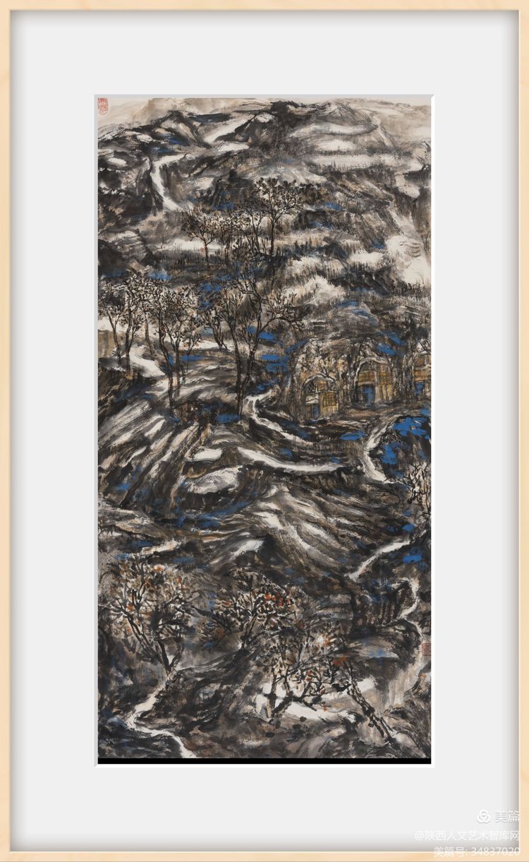 中國的古詩含蓄雋永,字字皆色,字字皆墨,行間字里水風墨韻,山蒼木秀,皆現(xiàn)其中,一如中國傳統(tǒng)的水墨畫風。中國的傳統(tǒng)繪畫蘊含豐富、亦有一種詩意之美?!霸娛菬o形畫,畫是有形詩”,詩畫相連本是中國畫的一種優(yōu)良傳統(tǒng)。藝術家把詩情貫穿于畫意中,使造型藝術與語言藝術相得益彰,互為補充,也反映出畫家的心態(tài)和繪畫美學思想。詩與畫都通過作者主觀的情感和豐富的形象,集中而概括地反映客觀現(xiàn)實。任何藝術作品都是社會生活的客觀因素和藝術家的主觀因素的有機結合,詩與畫也不例外。詩與畫都包含著藝術家的主觀情感,作品的情感性愈濃烈,越能感染欣賞者,就越富有藝術魅力。詩與畫中凝結著藝術家的各種情結,具有藝術最根本的屬性――關照心靈。我的作品《陜北初雪》可以說是對陜北這塊土地的一種感情上詩意獨白?!把┚啊迸c“寒林”是整幅作品的主角,為了表現(xiàn)兩者在自然山水中的蒼茫靜氣,使其富有詩意。以留白和焦墨分別描寫白雪與古木寒林,體現(xiàn)出雪的潤潔、林木的蕭瑟,賦予其幽靜嚴凝人物品質。在窯洞的色調上,選用黃色色調,與雪的白相互映襯,給觀者以溫暖感,使他山不及家山好的調性自然傾瀉而出。整幅作品墨色華滋,層次豐富,把墨云淇水光,上下玻璃天之意境呈現(xiàn)給觀者。自古畫家皆愛雪,比如王維、范寬、黃公望等等,是因為冰雪具堅貞高潔得人格象征,雪景的靜所展示的并非是一個死寂沉沉的空泛之境,而是通過作品啟示人們嘈雜喧囂的世俗后其實有一個一個靜穆而疏淡的世界可以歸隱。每個人都可以以“寒林”自喻, 通過其寂靜而素凈的特點以表達自己內心的“靜”, 從而與外在的世俗世界拉開距離,使人從冷與靜的直觀感受中體味到內在躍動的生命氣息,表達出一種堅定不屈的信念和孤清幽靜的情致。