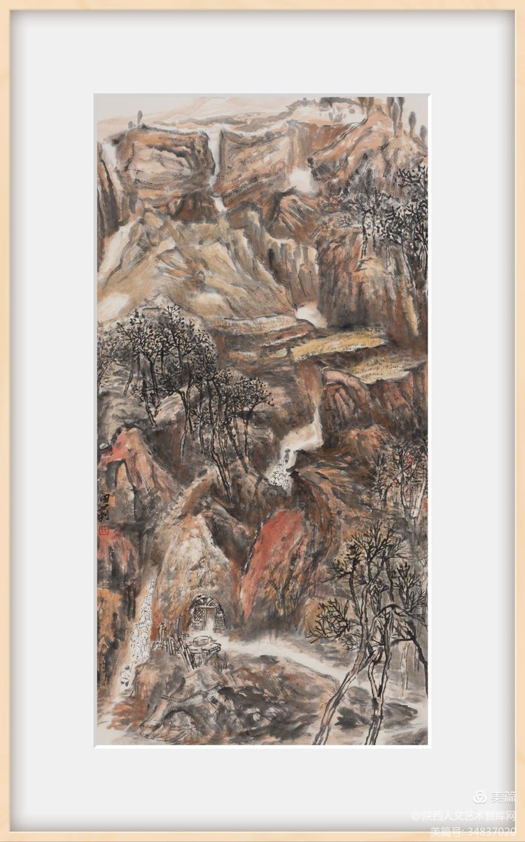 隨著畫家對自然美在認識上的不斷深入和發(fā)展,表現(xiàn)自然美的山水畫在筆墨技法上也有了相應的變化。中國山水畫傳統(tǒng)構圖形式有S型、z型、C型、三角型、三疊兩段式構圖等法則。黃土高原地貌獨特,溝壑縱橫,錯綜復雜。傳統(tǒng)構圖不易表現(xiàn)其開門見山之氣象。在創(chuàng)作中需考慮在傳統(tǒng)構圖的基礎上開創(chuàng)出新的構圖形式,宜采用平行,重復等手法方能體現(xiàn)出黃土高原單一中具重復,平行中具復雜的獨特地貌。我的作品《黃土風情》就是通過對黃土高原自然風貌的藝術處理,在傳統(tǒng)構圖的基礎上進行再思考的一幅山水之作。作品繪制精心,娓娓道來,采用自然樸實的筆墨語言描繪粗獷的陜北高原,賦予其雋永深長的意味。作品從不同視角表現(xiàn)高原、溝壑、黃土、窯洞、林木等景觀,三段式構圖分割構成整個作品的層次,近密遠疏,韻律感強。把陜北地域特征和生活氣息展示給觀者。近景山石泉樹關系融恰,遮擋有度,藏露,曲折,層次一一而出,畫意亦隨之而出。中景的窯洞是作品的靈魂,具有豐富的趣味,且異常醒目,成為視覺關注焦點,顯得重點突出,主次分明,因而更加引人入勝,雖沒有人物的出現(xiàn),卻是生生不息的生命力的最有力的表達,其間透露出更多的是一種生活化的構圖和審美趣味,使陜北高原風貌在山水畫中具有了更符合其特質的形式美。