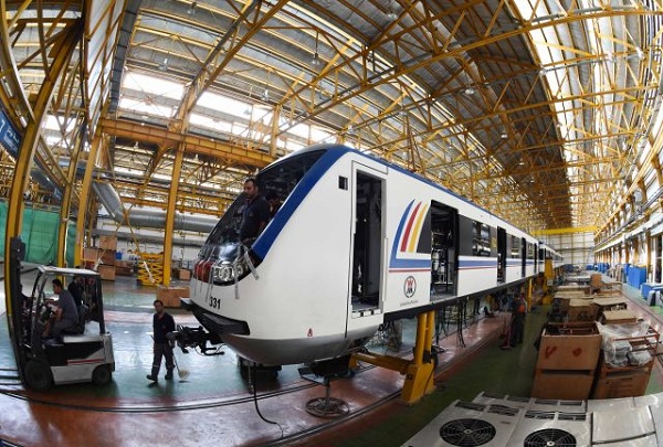 2016年9月4日,伊朗德黑蘭,工人在德黑蘭軌道車(chē)輛制造公司下屬軌道車(chē)輛組裝廠內(nèi)組裝車(chē)輛。伊朗首都德黑蘭5條地鐵線全部由中國(guó)公司承建。新華社記者 羅曉光 攝