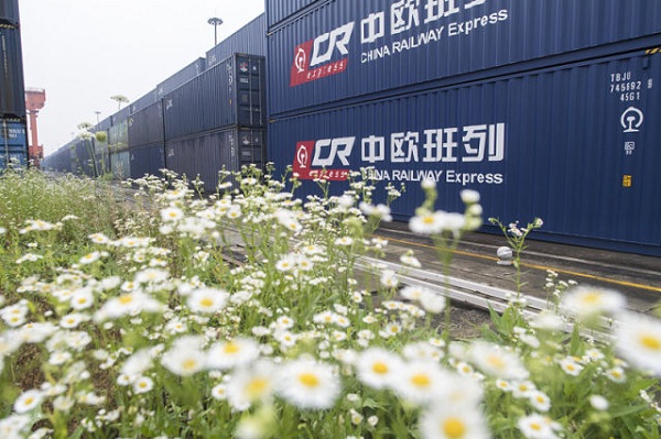 這是中歐(武漢)班列起點(diǎn)、武漢鐵路集裝箱中心站內(nèi)的中歐班列集裝箱(5月11日攝)新華社記者 肖藝九 攝