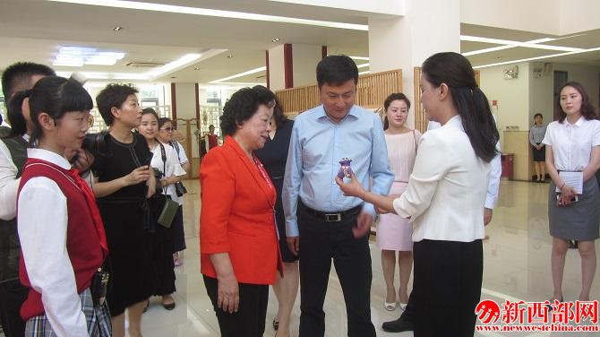 西安市曲江第一小學(xué)校長陳娟向陜西省人大常委會副主任郭大為和“知心姐姐”盧勤介紹學(xué)生手工作品。