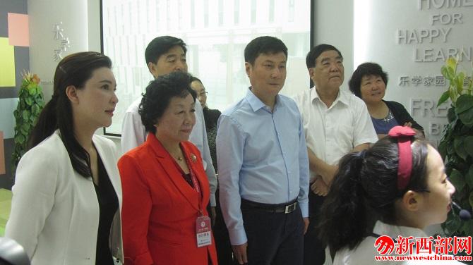陜西省人大常委會副主任郭大為(前排左三)、陜西省慈善協(xié)會會長劉維?。ㄇ芭抛笏模?、“知心姐姐”盧勤(前排左二)、西安市曲江第一小學(xué)校長陳娟(前排左一)參觀學(xué)生手工作品。