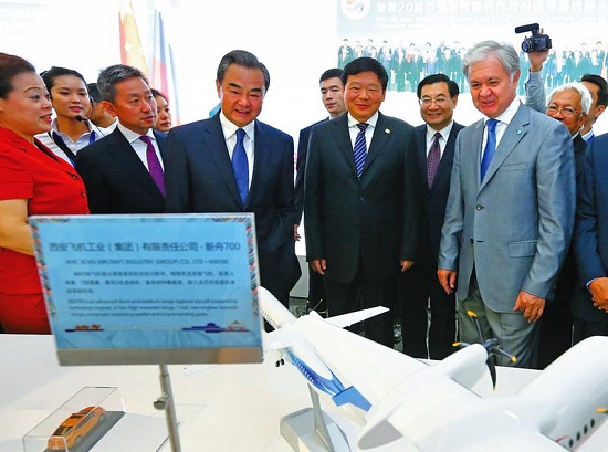 7月5日,在外交部舉辦的陜西全球推介活動上,外交部部長王毅、陜西省委書記婁勤儉、 陜西省長胡和平和參會的外國駐華大使一起參觀陜西特色展示。