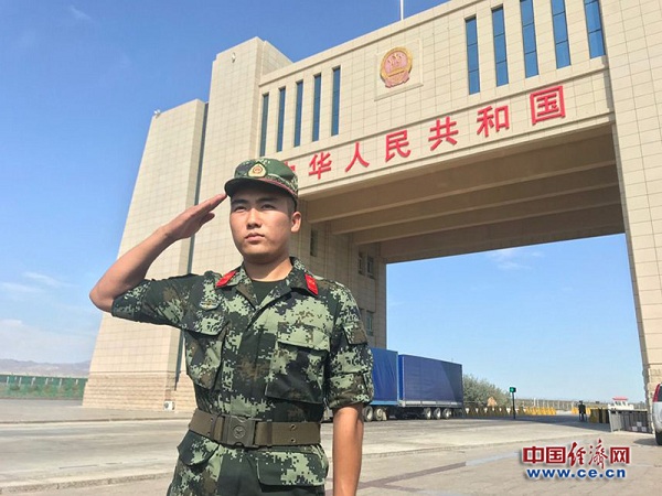 阿拉山口邊檢站監(jiān)護(hù)中隊(duì)一班副班長(zhǎng)蔣文澤告訴記者,他在邊防檢查站已經(jīng)有三年,主要負(fù)責(zé)出入境邊防檢查和交通運(yùn)輸工具的檢查。伴著一聲汽笛長(zhǎng)鳴,一輛國(guó)際班列緩緩駛來(lái)?!霸趪?guó)門前,每天看著一輛輛進(jìn)出的班列,覺(jué)得自己的付出很值得”,蔣文澤說(shuō)。