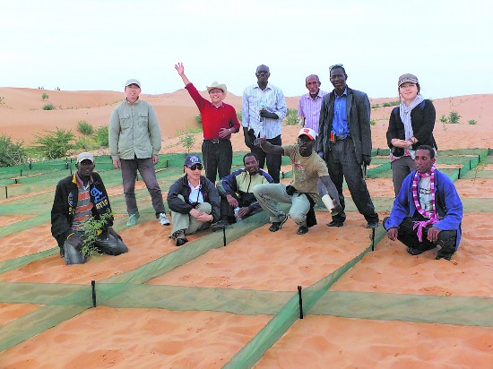 圖為中國科學(xué)院新疆生態(tài)與地理研究所防沙治沙團(tuán)隊(duì)工作人員和毛里塔尼亞當(dāng)?shù)厝艘黄疬M(jìn)行機(jī)械防沙實(shí)驗(yàn)時(shí)合影留念(資料圖片)。