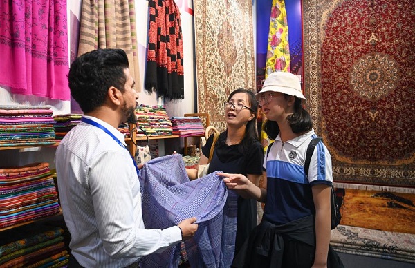 8月17日,參觀者在交流合作館吉爾吉斯斯坦展區(qū)了解特色商品。新華社記者 鄒競一 攝
