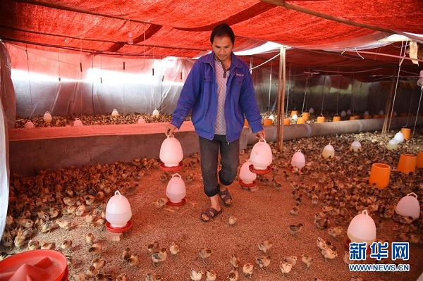 赤水市凱旋村村民在喂養(yǎng)雞苗(2015年11月12日攝)。新華社記者劉續(xù)攝