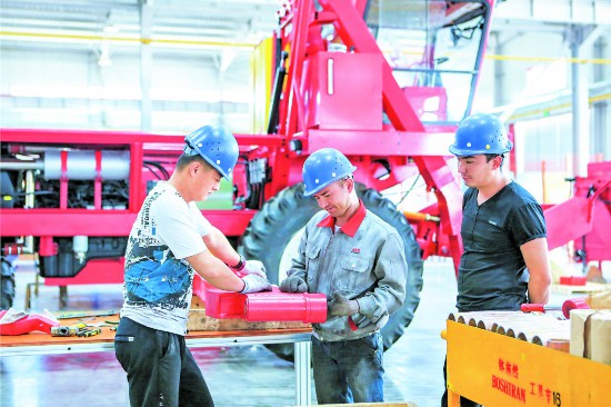 5月25日,沙雅缽施然智能農(nóng)機(jī)有限公司工人正在裝配采棉機(jī)。該公司由浙江省嘉興市援疆指揮部去年2月引進(jìn),當(dāng)年9月投產(chǎn),目前已吸納142人就業(yè)。俞劉東 攝