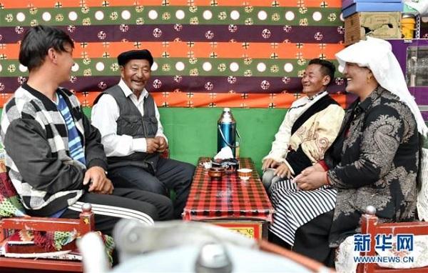 從那曲雙湖縣搬遷到彩渠塘村的村致富帶頭人贊瓊(右二)和妻子、兒子一起陪79歲的老父親嘮家常(8月2日攝)。近年來,西藏自治區(qū)多措并舉,實施易地扶貧搬遷,解決“一方水土養(yǎng)不起一方人”的發(fā)展困境,使搬遷戶實現(xiàn)穩(wěn)定脫貧、安置區(qū)加快發(fā)展,為鄉(xiāng)村振興奠定了堅實基礎。西藏拉薩市當雄縣羊八井鎮(zhèn)彩渠塘村的150戶683名村民是2017年底開始陸續(xù)從那曲、阿里、昌都等地區(qū)極為艱苦的地帶搬遷而來的。村民原來大多在高寒地區(qū)隨牧而居、沒水沒電、缺醫(yī)少藥。來到新村后,不僅衣食住行和醫(yī)療都有了保障,還靠羊八井地熱溫泉旅游入股分紅,發(fā)展綿羊育肥、手工加工合作社等集體經(jīng)濟和就近就便務工增加收入,村民們過上了幸福的小康生活。新華社記者 張汝鋒 攝
