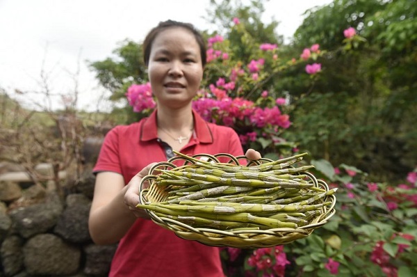 2019年3月14日,村民在海南??谑行阌^(qū)石山鎮(zhèn)施茶村石斛園展示新鮮的石斛。新華社記者 魯鵬 攝