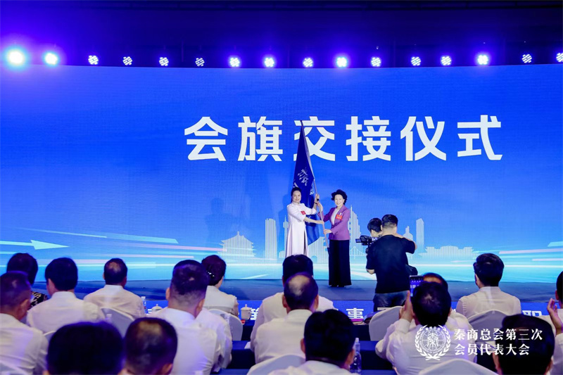會(huì)旗交接儀式現(xiàn)場(chǎng),秦商總會(huì)第二屆理事會(huì)會(huì)長鄭翔玲同新當(dāng)選的第三屆理事會(huì)會(huì)長崔榮華攜手登臺(tái),鄭翔玲會(huì)長將手中的秦商總會(huì)會(huì)旗交于崔榮華會(huì)長,600余名嘉賓共同見證秦商總會(huì)薪火相傳的盛況。