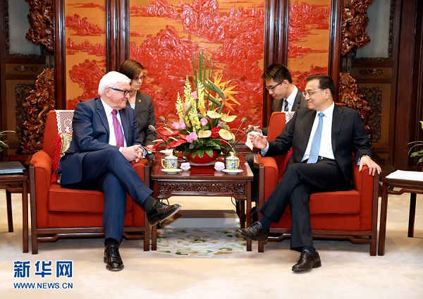 國務院總理李克強8日下午在中南海紫光閣會見來華出席第二輪中德外交與安全戰(zhàn)略對話的德國外長施泰因邁爾。