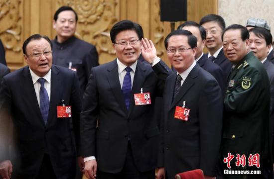 3月8日,十二屆全國人大四次會(huì)議新疆代表團(tuán)在北京人民大會(huì)堂舉行全體會(huì)議,并對(duì)中外媒體開放。圖為自治區(qū)黨委書記張春賢(前排左二)在會(huì)議結(jié)束后回答記者提問。中新社記者杜洋攝