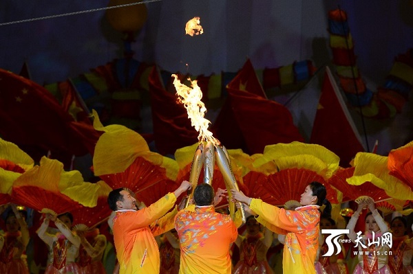 ????激動人心的時刻到來,十三冬圣火即將點燃。高空中銀絲飛架,最后一棒火炬手、先后打破并創(chuàng)造7項吉尼斯世界記錄、連續(xù)8屆在全國少數(shù)民族傳統(tǒng)體育運動會上獲得達瓦孜表演一等獎的阿迪力·吾休爾接過火炬,腳踏鋼絲,走向場中的雪花。他點燃引線,雪花頓時融化成火光四射的“冬”字型十三冬會徽,引燃了雪蓮花外形的主火炬塔,熊熊圣火燃起,新疆冰上運動中心上空一片通紅。