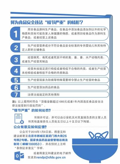 第十二屆全國人大常委會第十四次會議審議通過的新《食品安全法》已于10月1日起施行。為深入貫徹落實新《食品安全法》,國家食品藥品監(jiān)督管理總局按照最嚴(yán)謹(jǐn)?shù)臉?biāo)準(zhǔn)、最嚴(yán)格的監(jiān)管、最嚴(yán)厲的處罰、最嚴(yán)肅的問責(zé)“四個最嚴(yán)”的要求,起草了《食品安全法實施條例》修訂草案,并于昨天起征求社會各界意見。