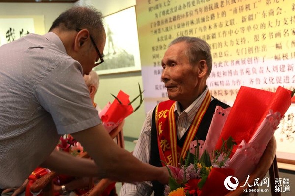 當日,曾任過白求恩的臨時翻譯盧璋;黃埔第17期的抗戰(zhàn)老兵彭煥揚;原蘭州第八戰(zhàn)區(qū)上尉鐘梓林;滇緬公路上的“南僑機工”第九中隊“華僑先鋒大隊”上尉隊長李民生四位當年的抗戰(zhàn)老兵也到現(xiàn)場,參加本次書畫展。本次書畫展還得到書畫家們的大力支持,很多書畫名家潛心創(chuàng)作,積極參與。中國美術家協(xié)會會員、國家一級美術師、享受國務院津貼的新疆著名畫家龔建新,得知書畫展的消息后,專門創(chuàng)作出一幅《醉打山門》的畫作,還有中國美術家協(xié)會會員、新疆美術家協(xié)會副主席、享受國務院津貼的新疆著名畫家鄶振明,也專門為此次書畫展創(chuàng)作了一幅極具代表性和感染力的佳作——《松山一九四四》。新疆知名書畫家創(chuàng)作出百余幅書畫精品助力此次書畫展及參與慰問抗戰(zhàn)老兵活動。