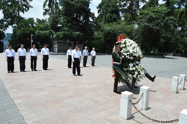 新華網(wǎng)北京6月16日電據(jù)新華社客戶端報(bào)道,藍(lán)天白云,青松翠柏。習(xí)近平總書記16日離京來到貴州遵義考察,一下飛機(jī)就直奔紅軍山烈士陵園,向紅軍烈士紀(jì)念碑敬獻(xiàn)花籃。紀(jì)念碑四周的浮雕展現(xiàn)了當(dāng)年紅軍浴血奮戰(zhàn)的場(chǎng)景。在“突破烏江天險(xiǎn)”浮雕前,總書記駐足感嘆:“當(dāng)時(shí)要是過不去就危險(xiǎn)了……”碑上“紅軍烈士永垂不朽”8個(gè)字是鄧小平同志題寫的,他佇立凝望,聽取介紹。這是黨的十八大后習(xí)近平總書記第一次來黔考察。