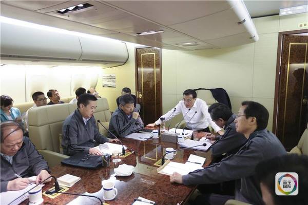 會議桌上的茶水杯里,茶水有些晃悠。李克強和部長們的交談,音調要比平時提高不少,這樣才能蓋過一直縈繞會場的發(fā)動機轟鳴聲。舷窗遮光板推開一條小縫,窗外是透亮的天穹,云層鋪展在機翼下。這些細節(jié)無時不在提醒著這場會的特殊之處,畢竟是在萬米“高空”之上。