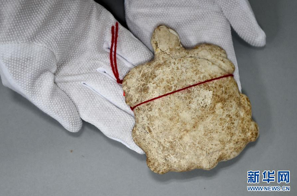 工作人員向記者展示追回的文物——紅山文化玉龜(4月10日攝)。