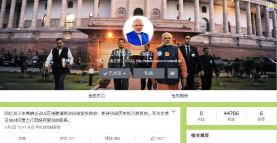 莫迪在微博中表示期待西安之行。(圖片:莫迪微博截圖)
