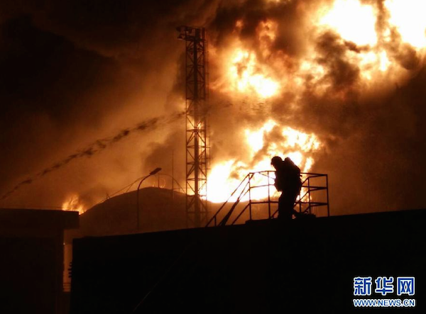 昨日23時39分,現(xiàn)場消防指揮員對新京報記者介紹,廠內(nèi)火勢還在蔓延,目前只能控制,不能進入現(xiàn)場滅火,不排除有進一步爆炸的可能。據(jù)廠方工作人員向消防人員介紹,廠內(nèi)已有3個一萬立方的油罐起火。