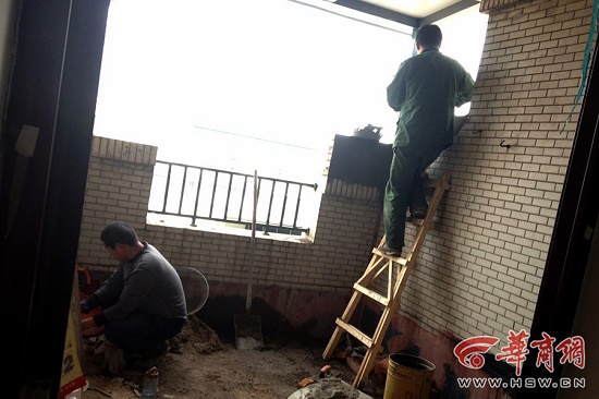 30日,記者來到位于西安南郊的圣合家園小區(qū)發(fā)現(xiàn),大多數(shù)頂樓的業(yè)主都將露臺上搭建了彩鋼板,彩鋼板和地面之間用落地玻璃連接,多家業(yè)主將改造后的露臺當作陽臺使用。記者來到17棟4單元701的業(yè)主張阿姨家發(fā)現(xiàn),兩位泥工正在給墻面抹水泥,張阿姨說,前兩天下雨,污水堆積在露臺,很難清理,后來住在樓下的鄰居提意見,說污水漏到家里天花板上,墻面都開裂了。實在是沒辦法,跟小區(qū)物業(yè)講了一下,花了近3萬元把露臺包起來,但物業(yè)并沒有提出要交什么費用。