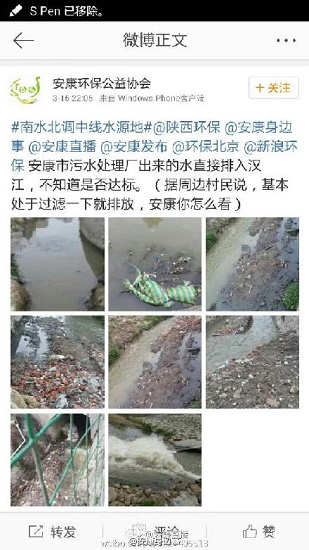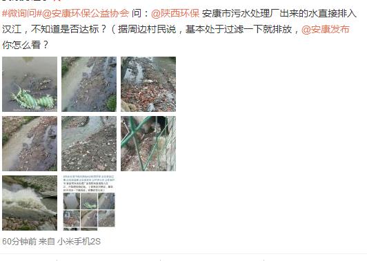 據(jù)新浪微博爆料:安康市污水處理廠出來的水直接排入漢江,不知道是否達(dá)標(biāo)?(據(jù)周邊村民說,基本處于過濾一下就排放,你怎么看?)