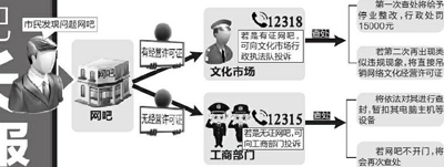 據(jù)西安市工商行政管理局個體私營經(jīng)濟監(jiān)管處工作人員介紹,市民在舉報違規(guī)網(wǎng)吧時,首先要觀察網(wǎng)吧有無證照,如懸掛經(jīng)營許可證等證照,可撥打12318向文化執(zhí)法部門投訴;如網(wǎng)吧內未懸掛證照,可撥打12315向工商部門投訴。