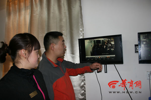 周丹婷的丈夫劉波與酒店收銀員查看監(jiān)控視頻