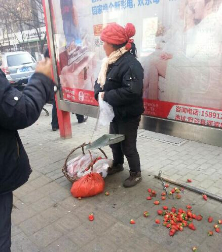 1月25日,榆林府谷中銀賓館對(duì)面,府谷城管車上下來(lái)一男一女,都沒穿制服,女的提起紅頭巾農(nóng)婦的一筐草莓就上了車。農(nóng)婦顧不得撒了一地的草莓,去執(zhí)法車窗前好言討要,誰(shuí)知,城管執(zhí)法車竟然加速開走了!如此執(zhí)法合適嗎?收走草莓不需要執(zhí)法單據(jù)嗎?收回去的草莓怎么處理了呢?