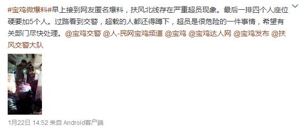 據(jù)新浪微博爆料:#寶雞微爆料#早上接到網(wǎng)友匿名爆料,扶風北線存在嚴重超員現(xiàn)象。最后一排四個人座位硬要加5個人。過路看到交警,超載的人都還得蹲下,超員是很危險的一件事情,希望有關(guān)部門盡快處理。