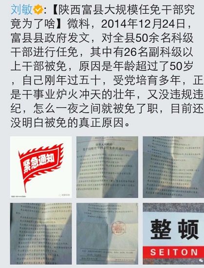 @劉大郎在微博配圖中貼出了富縣人民政府2014年第15號(hào)文件《富縣人民政府關(guān)于段緱管等同志任免職的通知》,共有51名富縣官員職務(wù)出現(xiàn)變動(dòng)。