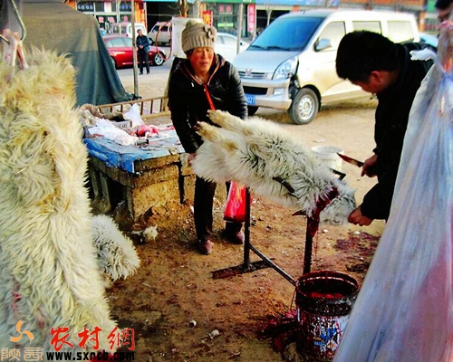 在神木縣第7中學(xué)對面,記者看見有一名男子和一名婦女正在宰殺羊,旁邊有一輛車,車上拉有七八只羊,已經(jīng)放血的有3只,還有一只正在放血。