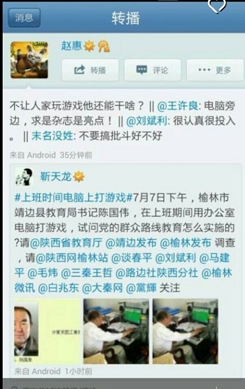 據(jù)新浪微博爆料:7月7日下午,榆林市靖邊縣教育局書記陳國偉,在上班期間用辦公室電腦打游戲,試問黨的群眾路線教育怎么實(shí)施的?請官方調(diào)查事情真相并回復(fù)處理結(jié)果;@靖邊宣傳@陜西省教育廳