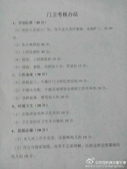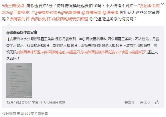 據(jù)新浪微博爆料:【安康自來水公司驚現(xiàn)霸王條款 保你月薪拿到一半】網(wǎng)友匿名爆料:因公司霸王條款,不人性化,月薪變半月薪水,私自換班扣5分,影響他人扣10分,消極思想且影響他人扣10分~致員工消極懈怠,怨恨無限,還讓人活命嗎?