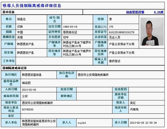 陜西省戶縣吸毒人員楊昌元2013年2月28日被戶縣公安局決定強(qiáng)制隔離戒毒(期限應(yīng)至2015年2月28日),在全國吸毒人員信息系統(tǒng)中顯示,楊此時(shí)還在西安市強(qiáng)制隔離戒毒所執(zhí)行戒毒,實(shí)際上楊一直逍遙社會(huì)。2013年3月4日,楊涉嫌尋釁滋事罪被戶縣公安局刑事拘留,3月6日被逮捕,同年12月3日刑滿釋放。刑滿釋放后應(yīng)當(dāng)繼續(xù)在戒毒所執(zhí)行強(qiáng)制隔離戒毒至2015年2月28日,但戶縣公安局有人將其放走,逍遙社會(huì)1年多。