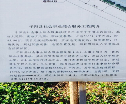 記者在千陽(yáng)縣了解到,千陽(yáng)縣社會(huì)事業(yè)綜合服務(wù)樓項(xiàng)目用地位于千陽(yáng)縣新區(qū),北臨文化路、西鄰?fù)斅?,占?0637.9平方米,約45.96畝。按照工程介紹,規(guī)劃總建筑面積33335.51平方米,其中地上建筑面積27503.42平方米,地下建筑面積4832.08平方米,總高6層。工程計(jì)劃投資8000萬(wàn)元,工期450天,計(jì)劃竣工日期為2014年5月24日。綜合樓設(shè)置信息化辦公室、流動(dòng)人口管理辦公室、農(nóng)村合作醫(yī)療經(jīng)辦中心、農(nóng)村養(yǎng)老保險(xiǎn)管理辦公室、勞動(dòng)就業(yè)管理辦公室、衛(wèi)生監(jiān)督、綜合執(zhí)法辦公室等61家事業(yè)綜合服務(wù)單位。