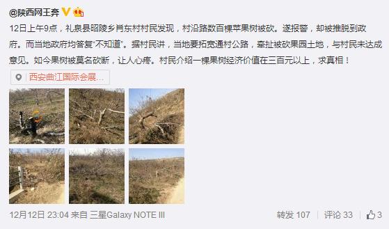 12日上午9點(diǎn),禮泉縣昭陵鄉(xiāng)肖東村村民發(fā)現(xiàn),村沿路數(shù)百棵蘋果樹被砍。遂報(bào)警,卻被推脫到政府。而當(dāng)?shù)卣饛?fù)“不知道”。據(jù)村民講,當(dāng)?shù)匾貙捦ù骞罚瑺砍侗豢彻麍@土地,與村民未達(dá)成意見。如今果樹被莫名砍斷,讓人心疼。村民介紹一棵果樹經(jīng)濟(jì)價(jià)值在三百元以上,求真相!