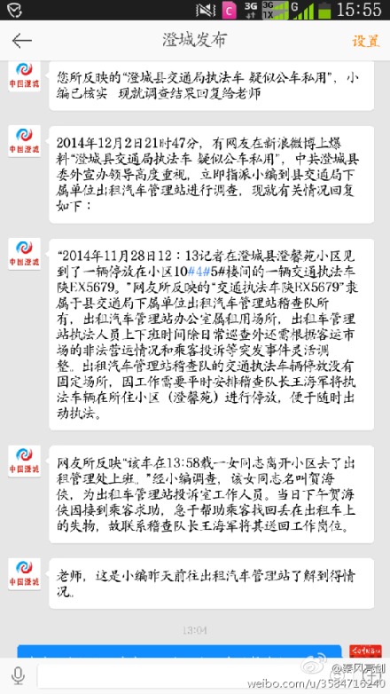 據(jù)新浪微博爆料:【澄城縣交通局執(zhí)法車疑似公車私用】2014年11月28日12:13記者在澄城縣澄馨苑小區(qū)見到了一輛停放在小區(qū)10#4#5#樓間的一輛交通執(zhí)法車陜EX5679。該車在13:58載一女同志離開小區(qū)去了出租管理處上班。記者在11:20分就在該小區(qū)門口并沒見該車進入小區(qū)。該車到底是幾點下班的?可以被當作私人交通工具嗎?