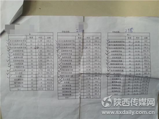 在子長縣一中學,學校老師給我們出示了學校今年的征訂單,在征訂單中我們可以看到:初一各種教輔材料每人共計139.84元,其中測試卷包括(數(shù)學、語文、英語)三科,每冊7.56元,三冊共計22.68元。初二各種教輔材料每人平均164.95元,其中測試卷包括(數(shù)學語文英語物理)四科,每冊7.56元,四冊共計30.24元。初三各種教輔材料每人平均191.25元,其中測試卷包括(數(shù)學語文英語物理化學)五科,每冊9.73元,五冊共計48.65元。