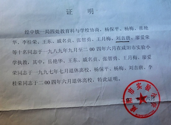 可是天有不測之風(fēng)云,在這里從教9年后,我們當(dāng)時年齡都才40來歲,我們在實驗小學(xué)分別擔(dān)任語文、數(shù)學(xué)課和班主任工作,是咸陽市實驗小學(xué)的骨干教師。在1997年6月中鐵一局四處瞄準(zhǔn)一個機會,為了達到減輕企業(yè)負擔(dān),把我們徹底甩掉免得再發(fā)工資,他們就采用欺詐手段將我們這些教了近30年書的教師,除一人外一律推向社會統(tǒng)籌,硬是強迫讓我們退休。并威脅說:如果不退就下崗,每月只發(fā)200元生活費。當(dāng)我們寫了按教師退休的申請后領(lǐng)導(dǎo)不同意,非讓我們寫按工人退休的申請書不可,我們說不會寫他們就拿來“工人退休申請書”的款式讓我們抄寫,萬般無奈我們只好按四處人事科提供的退休申請書樣本進行照抄,然后分別自我簽了字。他們卑劣的將偽造我們?yōu)椤盎炷凉ぁ惫しN檔案材料,把假檔案通過中鐵一局報到了陜西省養(yǎng)老統(tǒng)籌中心。這樣就有了1997年和2004年兩批教師共9人“提前”退休了。中鐵一局四處騙取了國家養(yǎng)老金,可是卻坑害了我們,嚴(yán)重損害了我們的權(quán)益!