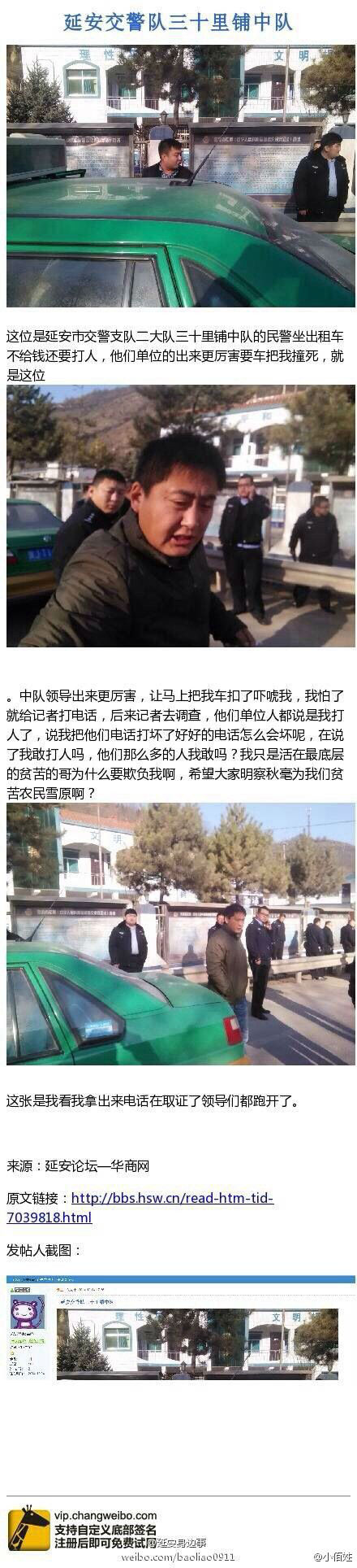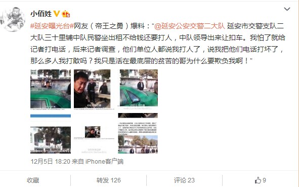 網(wǎng)友爆料:“@延安公安交警二大隊延安市交警支隊二大隊三十里鋪中隊民警坐出租不給錢還要打人,中隊領(lǐng)導(dǎo)出來讓扣車。我怕了就給記者打電話,后來記者調(diào)查,他們單位人都說我打人了,說我把他們電話打壞了,那么多人我打敢嗎?我只是活在最底層的貧苦的哥為什么要欺負我啊!”